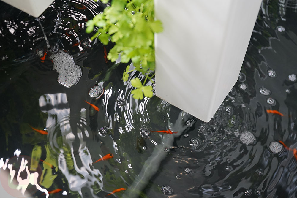 Besides the greenhouse structure, the entry-level model (8,590 euros VAT incl.) only offers the central module with the aquaponic system where the fishes swim at the base of vertical towers supporting plants. The waste from fish fertilizes the vegetable growing while their roots clean the water by absorbing the waste. Aquaponic systems on average require about 10% of the water needed for regular farming.